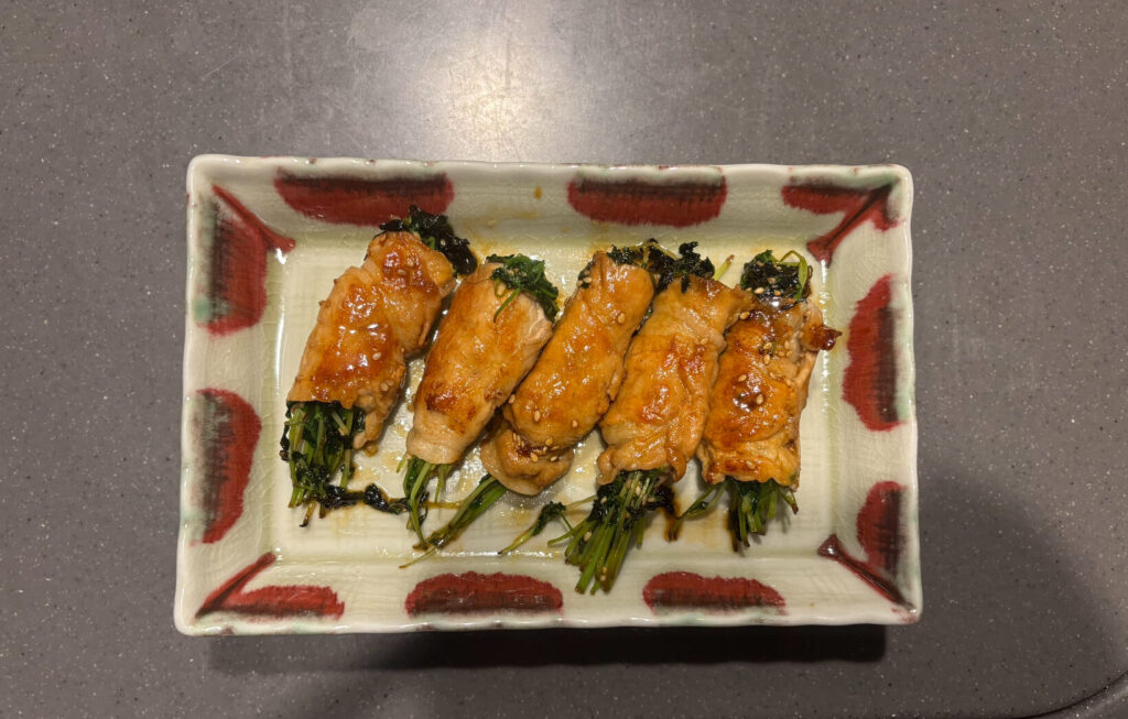 1. 豆苗を豚バラで巻き、巻き終わりを下にしてフライパンで焼く。